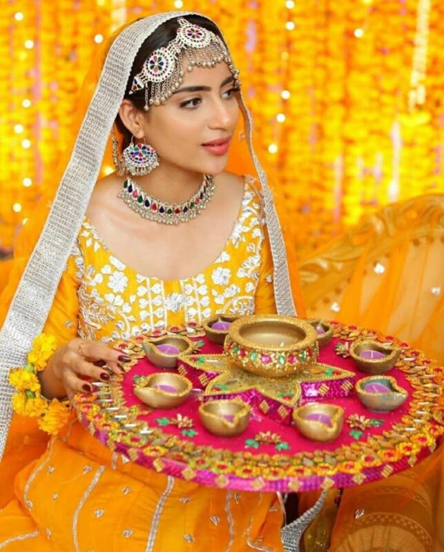 Everyone loves Mehndi functions in Pakistan and around the globe because they reflect cultural values and beliefs. This most-awaited event is about lively music, dance performance, and an entertaining atmosphere where everyone comes together, laughs, and creates lasting memories. It’s a primary wedding function where beautiful henna designs are applied to the bride’s hands. Her close friends and family members (aunts, sisters, mother, and cousin) also apply henna, prepare group dances, and sing songs. Trends are changing, but the yellow dress is still considered a traditional mehndi attire that makes a bride look more beautiful.
