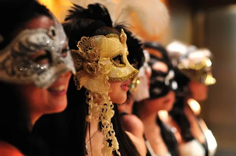 Add mystery and elegance to your sangeet Indian wedding with a masquerade ball theme. With glamorous outfits paired with ornate masks, you can create an aura of intrigue and sophistication. This wedding theme is a mixture of Indian and Western themes and the right music will set the mood. You can incorporate interactive elements like a mask-decorating station or a photo booth to enhance the fun. This unique theme guarantees an unforgettable and enchanting sangeet marriage celebration.